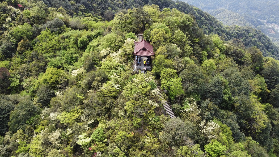 道观镶嵌在山顶,