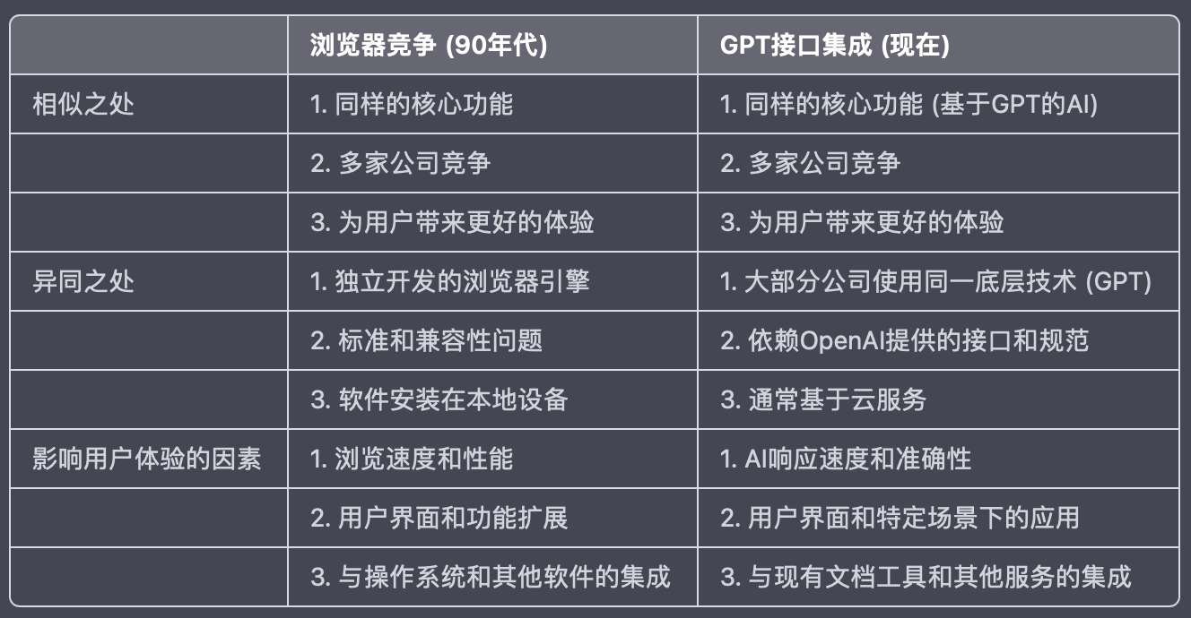 在互联网科技史上,出现过类似的情况,比如网页浏览器的竞争。在90年代,许多公司都在开发自己的浏览器,如 Netscape 和 IE。虽然它们在核心功能上相似(即浏览网页),但它们之间的竞争导致了各种创新和改进,为用户带来了更好的体验。