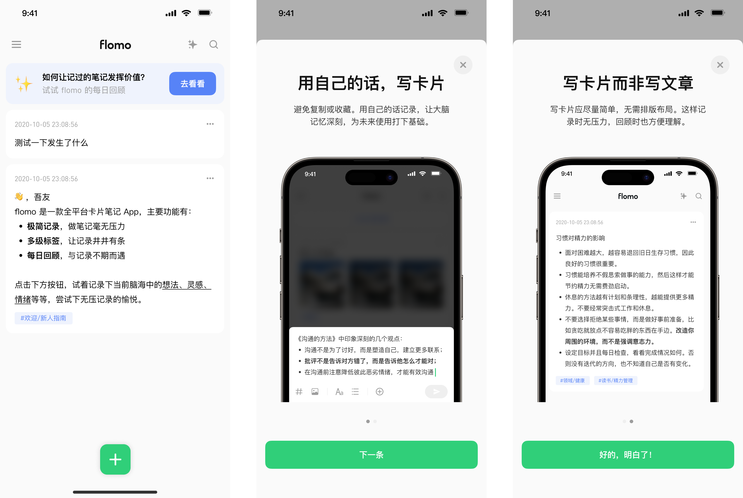 但显然我们不能指望每位 flomo 用户都看过我们写的书、演讲、文章之后才来使用。所以在去年做了一个很重要的决定,就是去 flomo 101 化 —— 提取出来最关键的几条规则,以产品化的形式告诉用户,而不是用几十篇文章,甚至一本书。
