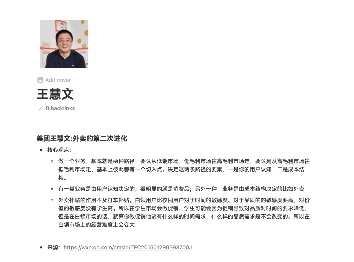 聚焦在人物身上的深入挖掘,比如当时我也整理过关于王慧文的内容,但是只是把文章合集拼凑在一起。但是他会从这些内容中,提炼出来这个人的核心思路,以及对应的方法论 —— 一个人对外的资料足够多,他不变的内核就越好被挖掘出来,比如他曾系统的整理了张一鸣的所有读书、微博,甚至包括大学时代发表的东西(所以我说 fonter 是互联网考古第一人,随身携带洛阳铲 😂)
