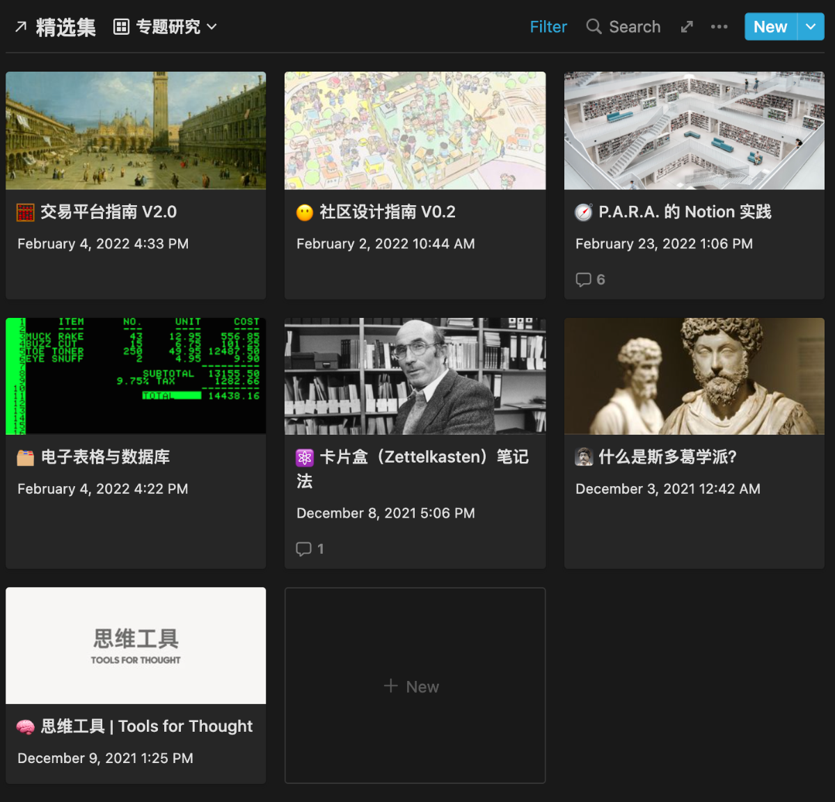 除此之外,还在某个长假的时候,仔细学习了下 Notion 的数据库是怎么回事。但学习完了总要开始练手,于是就想干脆把 Pinboard 的内容做个精选集,一来练手,二来炫酷时尚(对,就是这么肤浅) 。