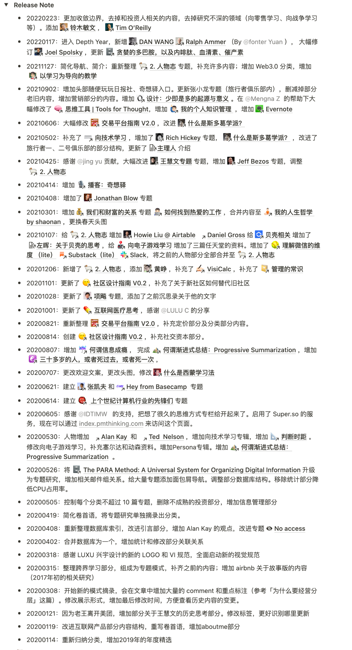 我在产品沉思录精选最下方其实一直有更新一个 release notes(如图),能看到每隔几个月都会进行一番修整。